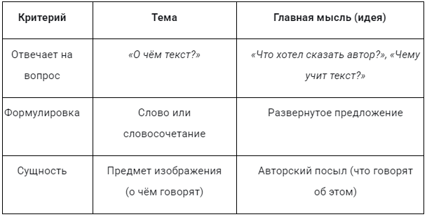 Если тема — это «о чём», то идея — это «что автор хотел сказать» по этому поводу. Следующая таблица наглядно показывает разницу, чем отличается мысль от темы текста.
