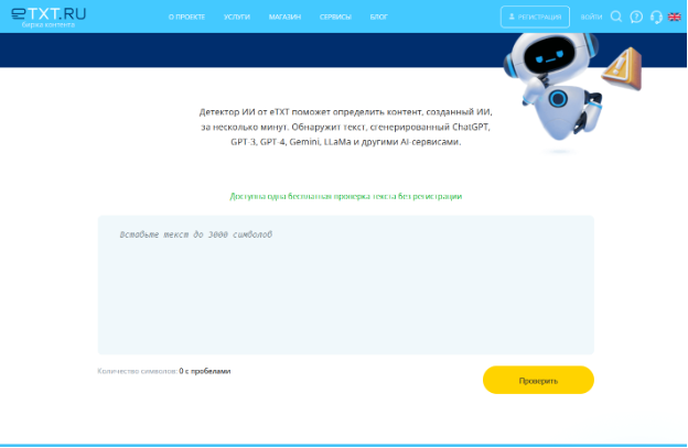 eTXT — российская биржа копирайтинга с собственным сервисом для проверки уникальности текстов (на рерайтинг и копии), к которому в 2024 году добавился детектор ИИ.