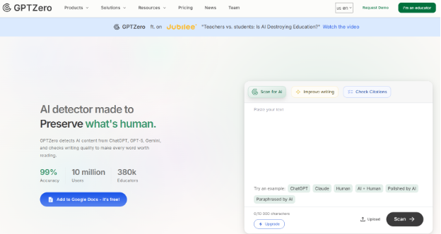 GPTZero — один из лидеров международного рынка, изначально разработанный для проверки студенческих работ. Функционал охватывает сканирование текстов объемом до 50 000 слов, выделение ИИ-фрагментов на уровне предложений и отдельных слов. Интерфейс доступен на английском, немецком, французском, испанском и португальском.