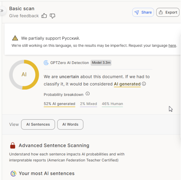 Данный ИИ-детектор работает по API на основе иностранного авторитетного сервиса, использует алгоритмы, обученные на русскоязычных данных, что делает его наиболее подходящим для СНГ-аудитории.