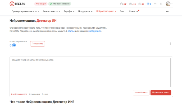 Text.ru — сервис для SEO-специалистов, анализирующий уникальность контента с точки зрения смысловых совпадений, а также предоставляющий данные о заспамленности и «водности» текста. Недавно была добавлена новая функция нейропомощника, который может проверить текст в том числе на наличие ИИ.