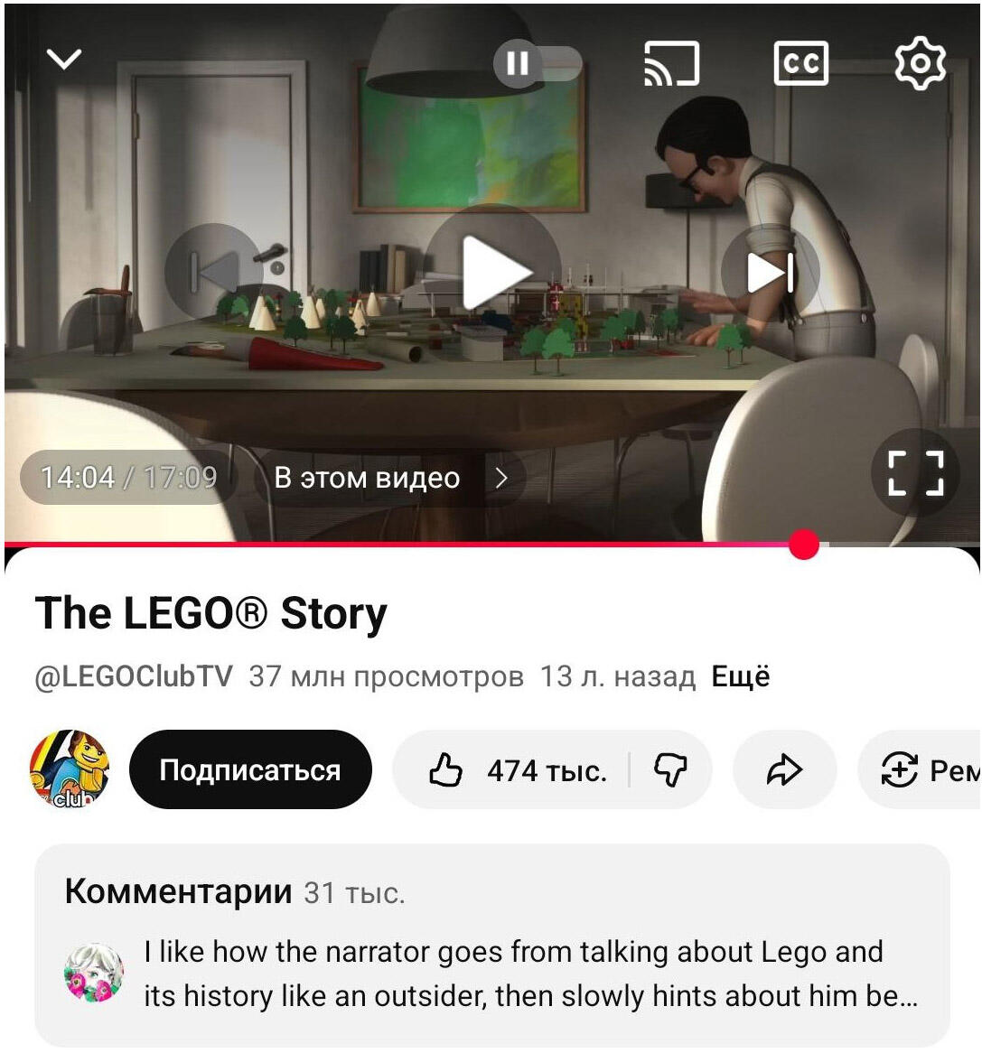 Реальный пример: к 80-летию LEGO выпустила 17-минутный анимационный ролик, в котором внук основателя рассказывал историю компании. Результат — более двух миллионов просмотров и 90 тысяч репостов за несколько недель.