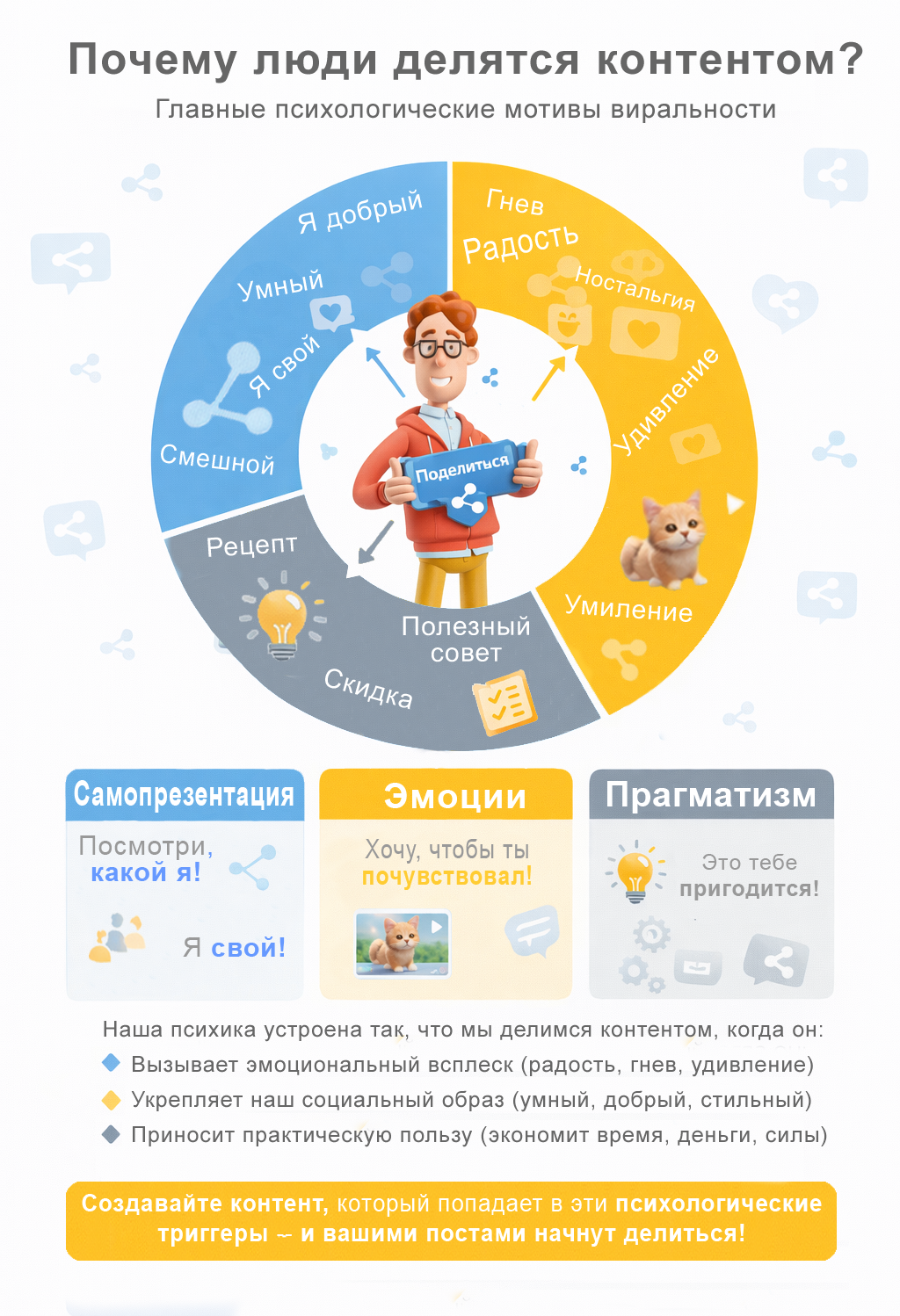 Люди делятся тем, что повышает их ценность в глазах окружающих. Это может быть демонстрация компетентности («я разбираюсь»), хорошего вкуса («я ценю красивое»), щедрости и заботы («я помогаю друзьям») или принадлежности к сообществу («я свой»). Контент становится валютой, которую человек вкладывает в свою репутацию.