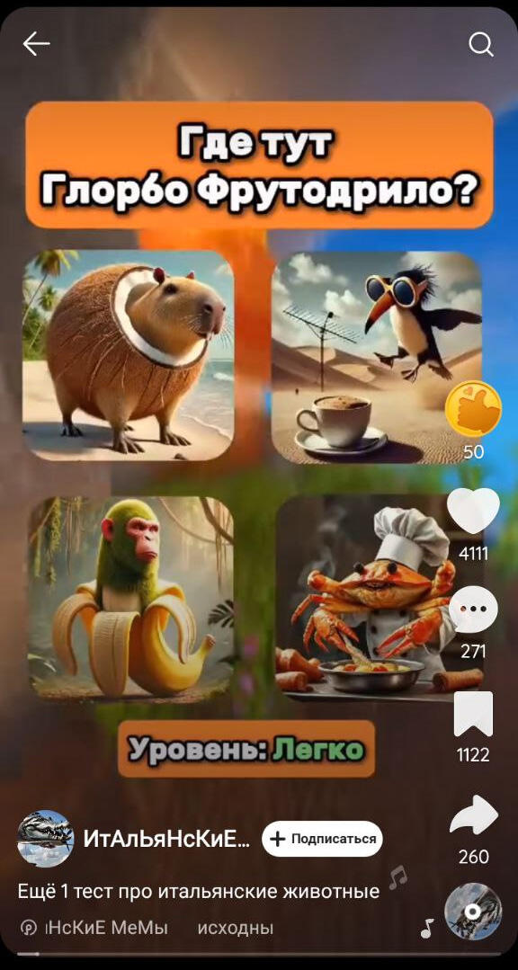 В 2025 году соцсети заполонил так называемый «ИИ-слоп» (AI slop) — абсурдные картинки и видео, созданные нейросетями. Отдельная категория вирусного AI-контента — так называемые брейнроты (от англ. brain rot – «гниение мозга»). Это мемы, где всё смешалось: животные, предметы, звуки и названия. За ними закрепилось общее название «итальянские животные».