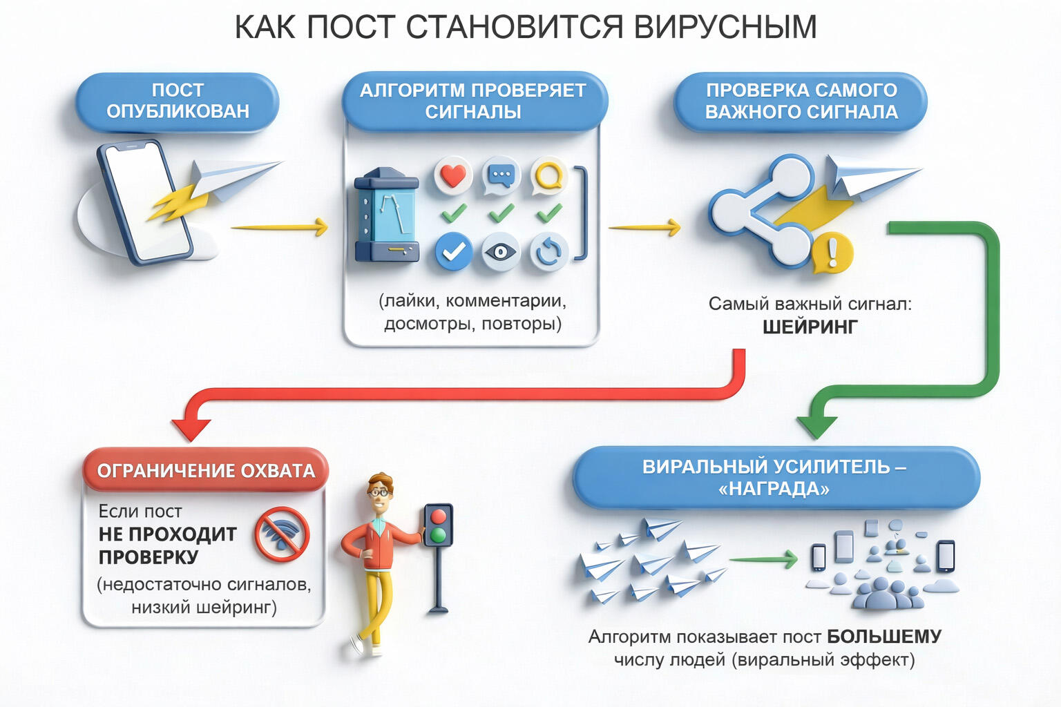 Но самый весомый сигнал — шейринг (от англ. share — «делиться»), или репост. Когда пользователь нажимает «Поделиться», он берет на себя ответственность за распространение контента, и для алгоритма это высший знак качества.