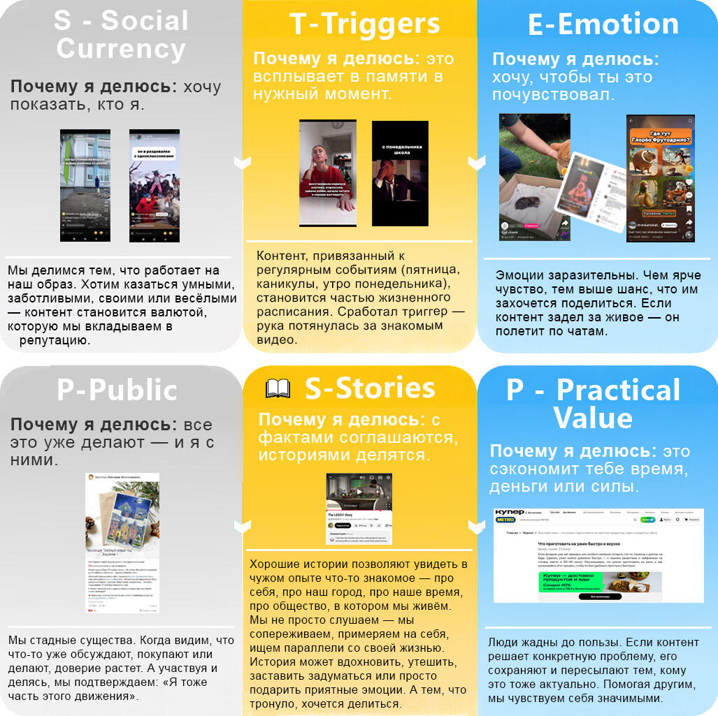 Мы свели все принципы STEPPS в единый коллаж. Это поможет быстро вспомнить суть каждой составляющей формулы виральности.
