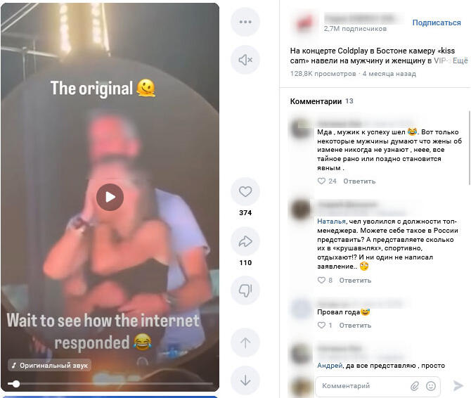 Сначала видео разошлось как забавный курьёз — редкий случай, когда kiss cam даёт осечку. Но настоящий взрыв произошёл позже, когда интернет-сыщики выяснили: оба героя состоят в браке с другими людьми. То, что выглядело как неловкость, оказалось случайным разоблачением служебного романа. Видео перестало быть просто забавным моментом и превратилось в готовую драму, которую стали обсуждать.