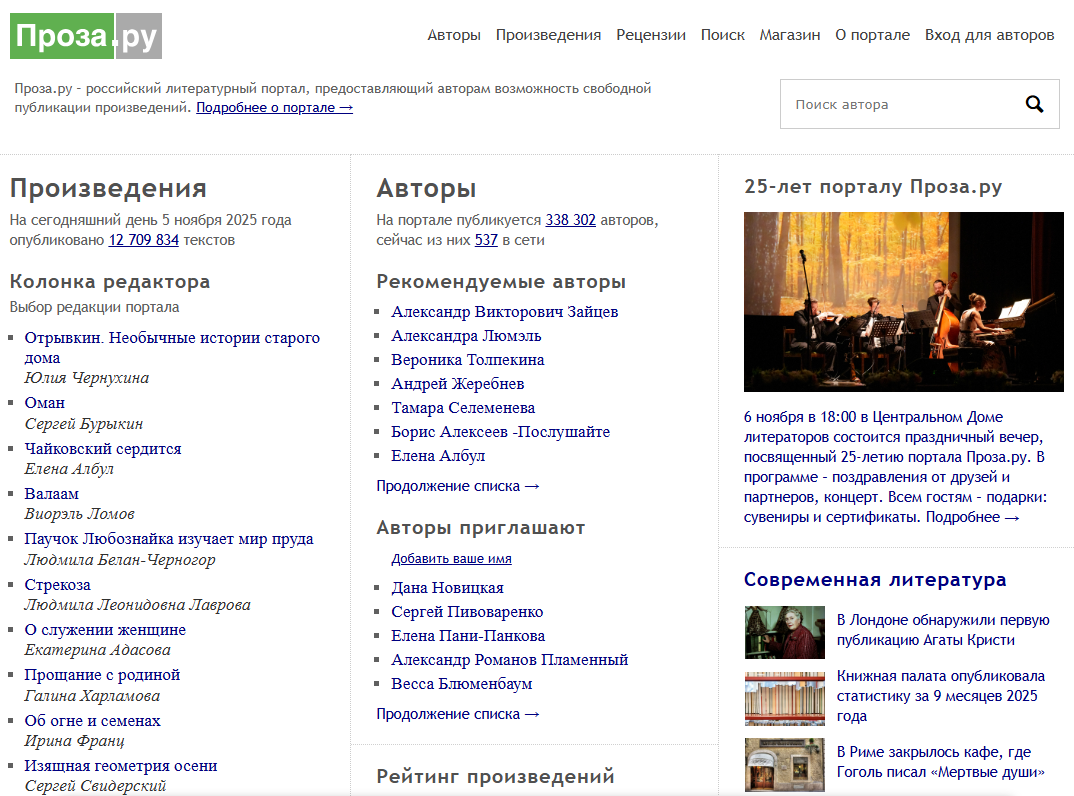 Proza.ru — это популярная платформа в русскоязычном интернете для писателей и поэтов, которая позволяет взаимодействовать с читателями. Здесь авторы могут не только публиковаться, но и заключать договоры на издание книг.