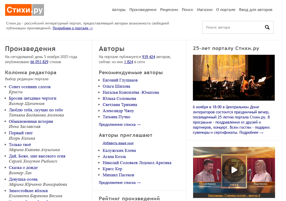 Этот сайт дает поэтам возможность делиться своими произведениями, получать обратную связь и находить потенциальных покупателей. Если вы ищете, где продать стихи собственного сочинения, в том числе изданные, то это подходящий ресурс. Это одна из крупнейших платформ в русскоязычном интернете, здесь широкая аудитория, обеспечивается значительный приток читателей и потенциальных поклонников творчества.
