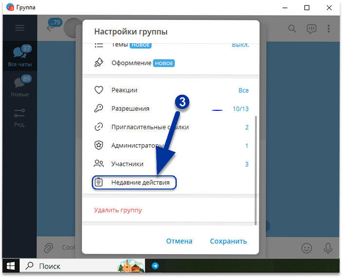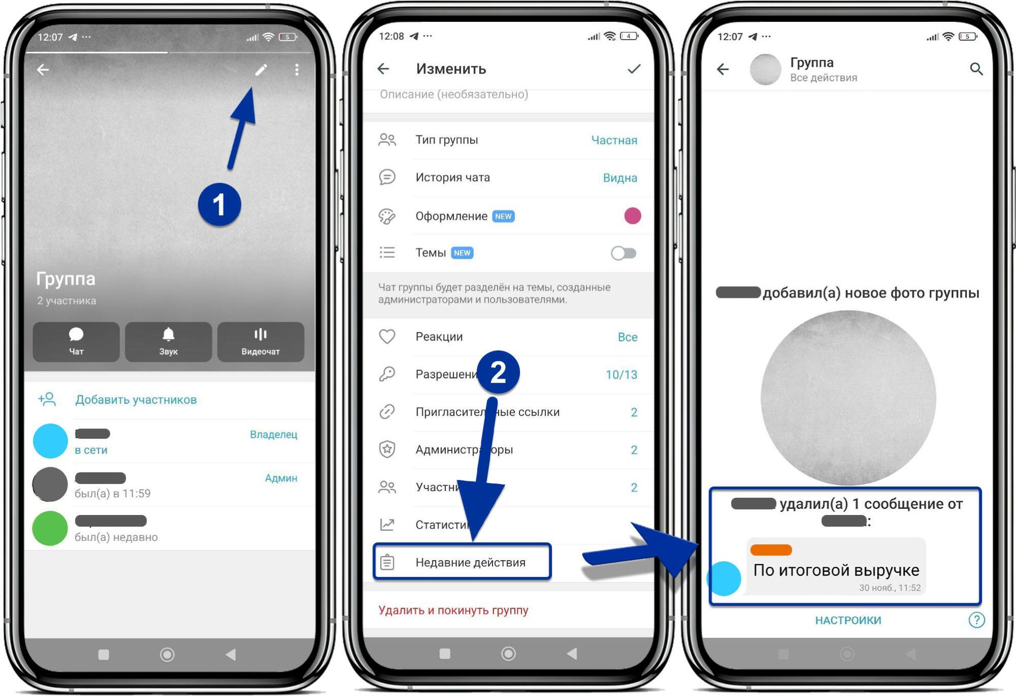 На скриншоте: как администратору канала посмотреть недавние действия в Телеграм.