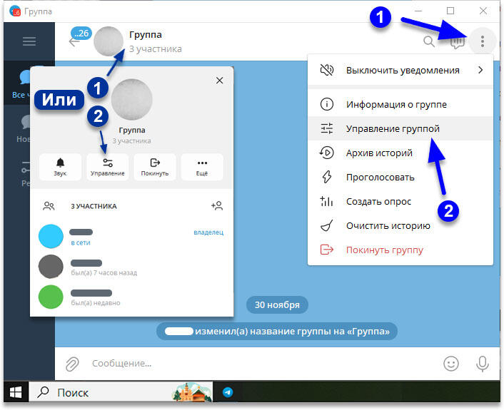 В мобильном приложении зайдите в нужный чат и нажмите на его название вверху. Тапните по иконке карандаша (или кнопке «Управление»).