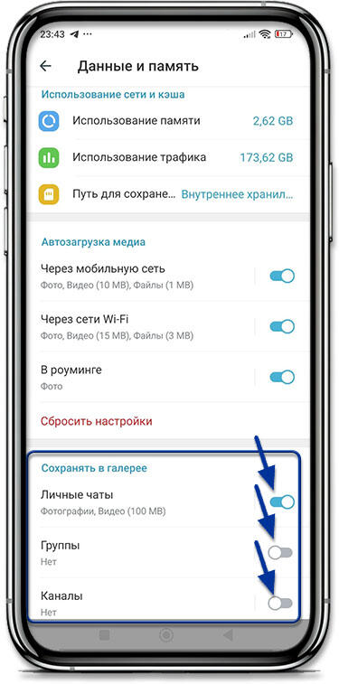 Галерея смартфона. Фото и видео из Telegram могут автоматически сохраняться в папках галереи и во внутренней памяти телефона (Внутренняя память/Telegram/, Внутренняя память/Android/media/org.telegram.messenger/). Настройка для автоматического сохранения находится в Telegram: «Настройки — Данные и память — Сохранять в галерее».