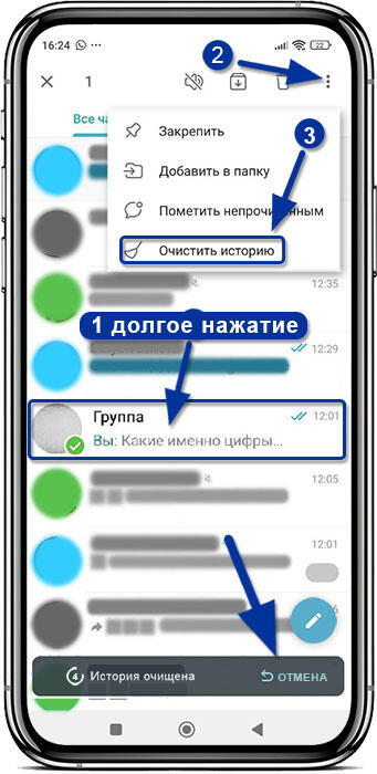 На скриншоте показана последовательность действий при удалении переписки из списка чатов и кнопка отмены. Вам дается всего 5 секунд, чтобы ее нажать.