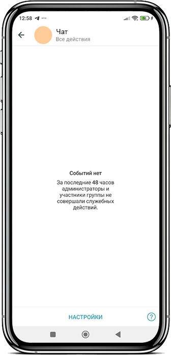 Скриншот: если за последние 48 часов в чате не совершались служебные действия, то в разделе недавних действий администратор увидит сообщение об отсутствии событий.